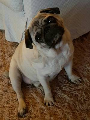 Mops, geb. 02.02.2010, 33 cm groß und (noch) ca. 11,8 kg schwer, ist ein ganz typischer Vertreter seiner Rasse.