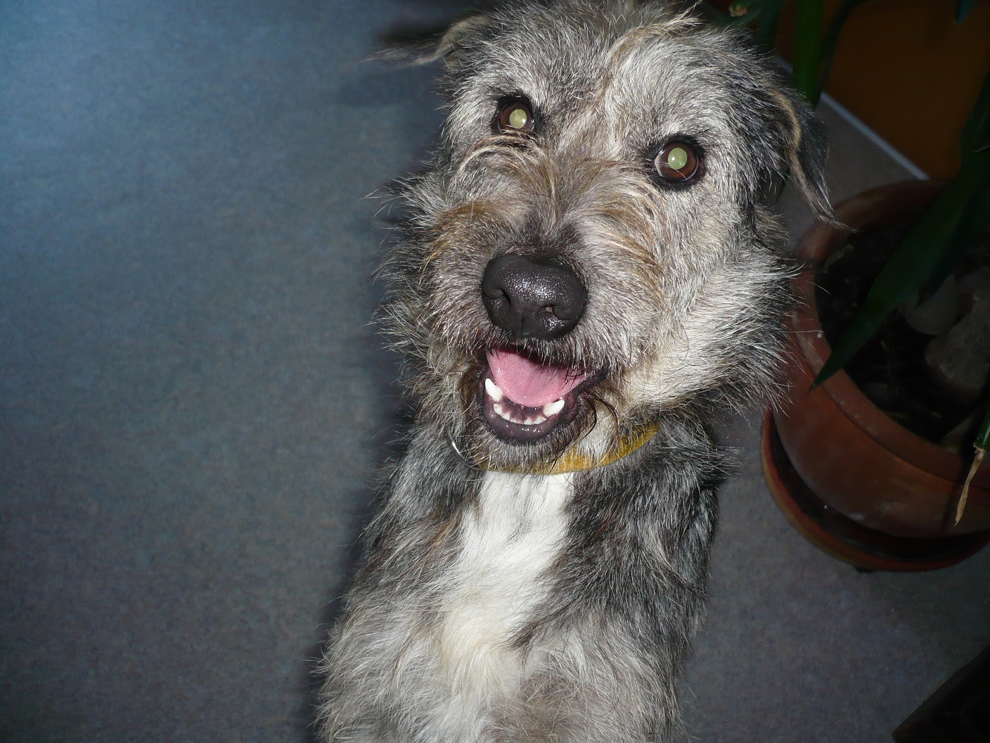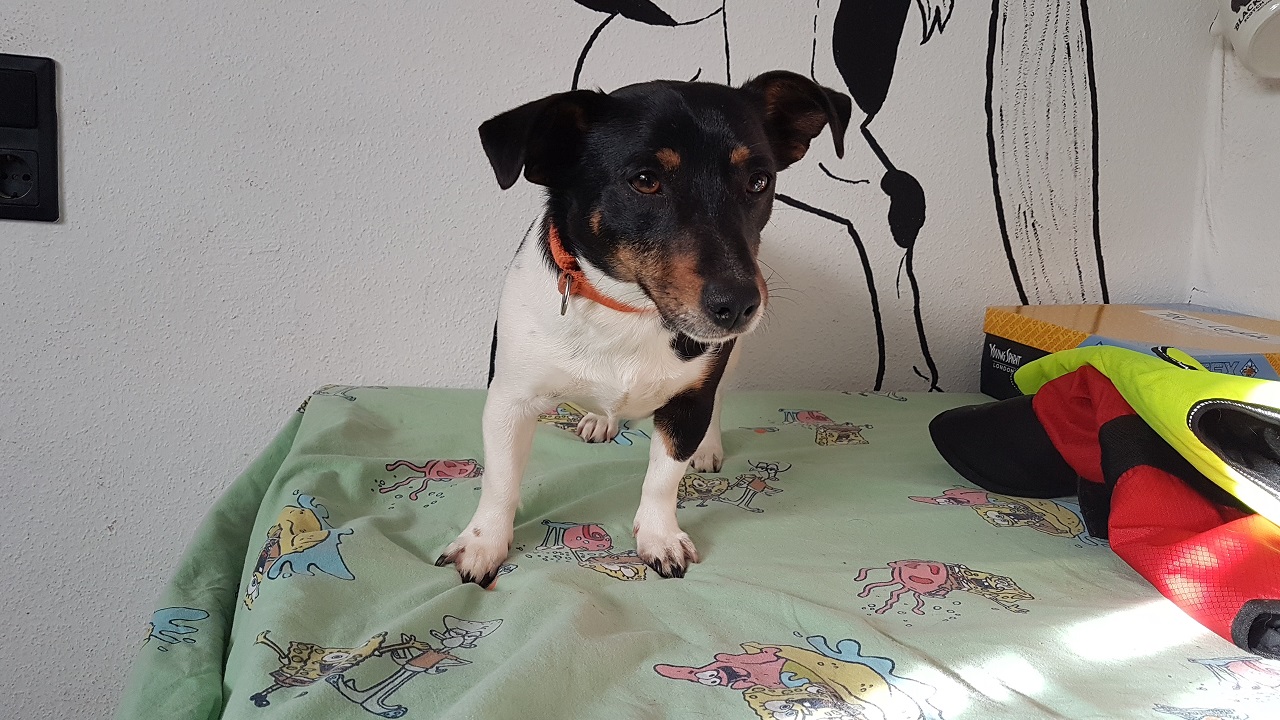 Sie rennt Schwanz wedelnt durch die Wohnung und schaut ihr Pflegefrauchen fröhlich an.