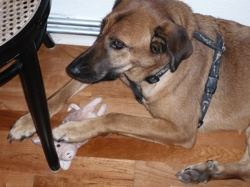 Selbst für kürzere Zeit ohne andere Hunde alleine bleiben kann Tamira schon. Sie jammert nicht dabei und macht auch nichts kaputt.