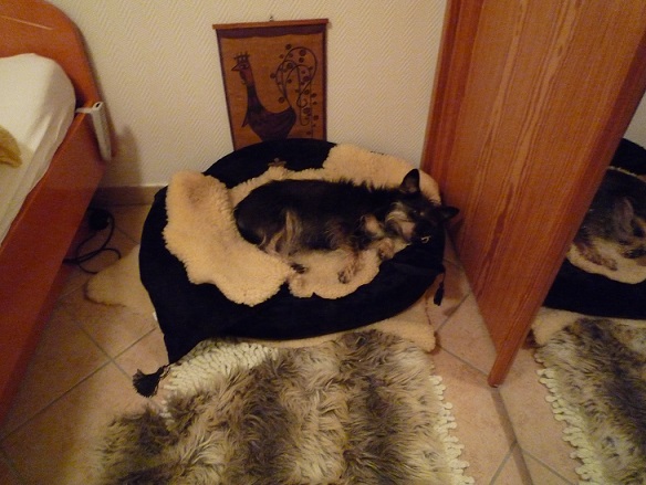 Ist aber Ruhe angesagt oder gerade niemand zum Spielen da, dann kuschelt sie sich ruhig auf ihren Platz und schlummert friedlich träumend vor sich hin.