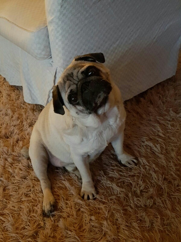 Mops, geb. 02.02.2010, 33 cm groß und (noch) ca. 11,8 kg schwer, ist ein ganz typischer Vertreter seiner Rasse.
