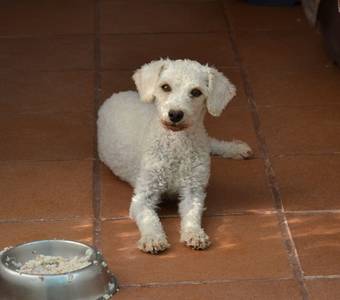 Poldi ist eine bezaubernde Pudel-Mix-Dame mit ca. 41cm und 11,5kg. Geboren ist sie etwa 03/2011. Sie wurde in sehr vernachlässigtem Zustand aufgegriffen, dass Fell lang und verfilzt. Nun wurde sie gebadet und geschoren und man sieht, welch Schönheit dabei heraus kam! Ihre schwarzen Locken bringen ihre schönen gold-braunen Augen so richtig zur Geltung. Und so lieb, wie sie mit diesen Augen schauen kann, ist sie auch. Sie ist nur nett und absolut unkompliziert, verträgt sich mit allem und jedem, geht freundlich auf jeden Menschen zu und freut sich über jede noch so kurze Streicheleinheit. Dazu ist sie auch stubenrein, kann (derzeit mit anderen Hunden) alleine bleiben, fährt gut im Auto mit, geht super an der Leine und ist katzenverträglich. Sicherlich ist diese verschmuste und verspielte Hündin auch gut für Hundeanfänger geeignet. Natürlich ist Poldi auch geimpft, gechipt, entwurmt und kastriert.