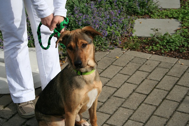 Sie geht vorbildlich an der Leine, gerne mit flottem Schritt und wedelt stets fröhlich dabei.